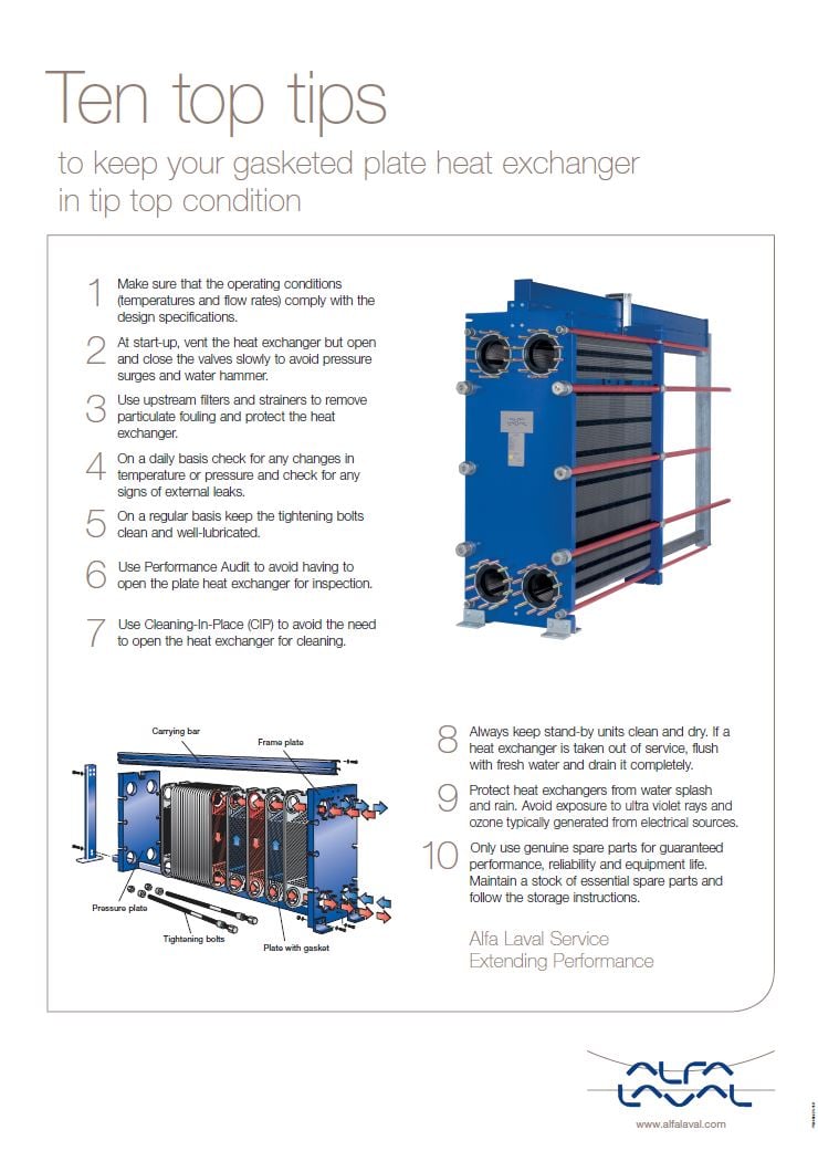With the right operating conditions and maintenance, your Alfa Laval gasketed plate heat exchanger will run like a dream. To help you get there, Alfa Laval has put together the Top Ten Tips checklist to help you maximize the reliability and uptime of your equipment.