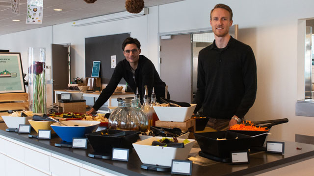 En digital vægt under hver enkelt ret på frokostbuffeten er et nyt syn for medarbejderne hos Alfa Laval i Søborg. Det samme er en skærm på væggen i kantinen, hvor alle kan følge med i udviklingen af, hvor meget mad der går til spilde, og hvor stort CO2-aftrykket er for de enkelte retter. Begge dele er de synlige beviser på samarbejdet mellem startup-virksomheden FoodOp og Alfa Laval, som har til formål at reducere madspild og forbedre menuplanlægningen.