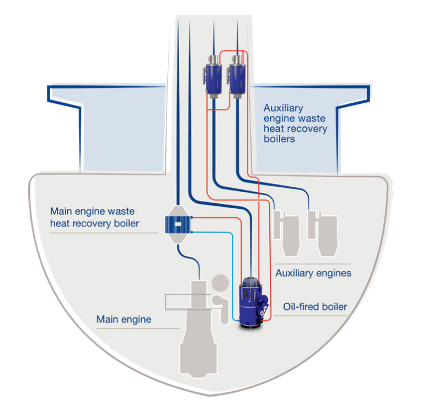 Onze oplossing wordt altijd afgestemd op uw stoombehoefte, de hoeveelheid uitlaatgas en de unieke kenmerken van uw schip. Deze kan bestaan uit: